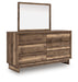 | Details | Includes dresser and mirror, Made with engineered wood (MDF/particleboard/plywood) and decorative laminate for the right balance of affordability and durability , Warm natural brown finish over replicated walnut grain with authentic touch, Decorative laminate replicates natural or man-made material surfaces with consistent color, pattern and texture, Integrated drawer pulls, 6 smooth-gliding drawers , Drawer interiors are lined with a faux linen laminate for a clean, finished look , Mirror attaches to back of dresser; can also be mounted on wall horizontally or vertically , Safety is a top priority, clothing storage units are designed to meet the most current standard for stability, ASTM F 2057 (ASTM International), Drawers extend out to accommodate maximum access to drawer interior while maintaining safety, Minor assembly required | |