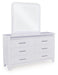 | Details | Includes dresser and mirror, Dresser made with hardwood solids and MDF substrates , Mirror made with solid wood, White paint finish, Dresser with inset acrylic glitter accents, Horizontal metal drawer pulls, 6 drawers with fully finished interiors, dovetail construction and heavy-duty ball-bearing side glides, Textured drawer fronts, Mirror with inset LED lighting; 3-way dimmer switch, Power cord included; UL Listed | |