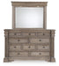 Details B916B2: Includes panel headboard, footboard with slats and rails, Made with hardwood solids, oak and ash veneer, cast resin components and engineered wood substrates, Tops with inlaid ash veneer border, Light warm grayish brown glazed wood finish, Breakfront pilasters, Inset picture frame panels, Headboard features light bridge with 2 overhead LED lights, Foundation/box spring required, sold separately , Mattress available, sold separately, Assembly required, B916B1: Includes dresser and mirror, Made with hardwood solids, oak and ash veneer, cast resin components and engineered wood substrates, Tops with inlaid ash veneer border, Light warm grayish brown glazed wood finish, Round metal knobs with satin nickel-tone finish, 10 drawers with fully finished interior, dovetail construction and ball-bearing side glides, Drawers with inset framed fronts, Dresser with breakfront pilasters, Mirror frame features light bridge with 2 mini LED lights, Mirror attaches to back of dresser,