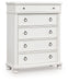 | Details | Made with hardwood solids, veneers and MDF substrates, Rubbed antiqued white finish, Metal hardware with pewter-tone finish, 5 smooth-gliding drawers with fully finished interiors, French/English dovetail construction and heavy-duty ball-bearing side glides, Top drawer felt lined | |