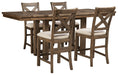 This counter height dining table set with upholstered bar stools elevates the art of casual rustic style. Notable refinements include through-tenon touches, plank-effect tabletop and distressed nutmeg finish that’s warm and welcoming. The space-efficient scale is especially suited to loft-style living, but two optional leaves ensure there’s plenty of space for parties up to eight.