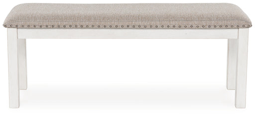 Signature Design by Ashley®Consumer's ChoiceThe Robbinsdale dining bench is sure to impress come mealtime. With its antiqued white finish and light gray upholstery with nailhead trim, modern ...