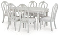 | Details | D795-35: Made with hardwood solids, acacia wood veneer, MDF substrate and cast resin components, Antiqued white finish, Tabletop with butterfly-matched veneer pattern, Removable center leaf, Table extends by pulling both ends and dropping in leaf, Seats up to 6, Dining chairs sold separately, Assembly required, D795-01: Made with solid wood frame and cast resin components, Antiqued white finish, Polyester upholstery, Foam cushioned seat, Includes adjustable levelers, Assembly required, | |