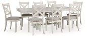 | Details | D642-01: Made with solid wood frame, Antiqued white finish with grain texture, Light gray polyester upholstery, Nailhead trim, X-back, Assembly required, D642-45: Made with rubberwood solids, ash veneer and MDF substrates, Antiqued white finish with grain texture, Tabletop with planked effect, Two 12" removable center leaves, Table extends to 86" overall by pulling both ends and dropping in leaves, Seats up to 8, Assembly required, | |