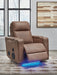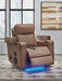 Details One-touch remote control with adjustable positions, Easy View™ adjustable headrest, power lumbar support, LED lighting on/off and auto glide, Corner-blocked frame with metal reinforced seat, Attached cushions; high-quality foam cushions wrapped in poly fiber, Faux leather upholstery, Built-in premium quality audio sound system with wireless connectivity and sonic bass in the seat, Armrests with flip-top storage; hidden Thunder control panel with adjustable volume, treble, bass and vibration, Heat in the seat element (with automatic 30-minute shutoff feature), Air massage system includes 3 settings: steady, pulse and wave (with automatic 20-minute shutoff feature), Gentle gliding motion, Ambient blue LED lighting on base for theater-style experience, Power cord included; UL Listed