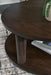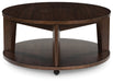 It's hard to say what's most striking about this round coffee table. Is it the rich warm brown finish or the thick tapered legs? Either way, the table's clean, contemporary aesthetic is perfect for your casual lifestyle. Casters let you roll the coffee table wherever you please … maybe next to your couch or loveseat.