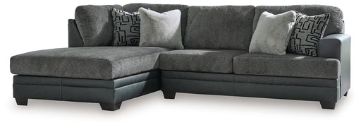Benchcraft®Appeal to your eye for ultra-contemporary design with this sectional. Chic and sleek in dark neutrals, it pairs cozy fabric with faux leather for i...