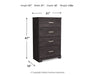 With its clean-lined look and modern attitude, this chest of drawers is a fresh style awakening. A warm charcoal hue over replicated oak grain easily complements other furniture finishes. Smooth drawer fronts with antiqued pewter-tone handles complete the aesthetic.