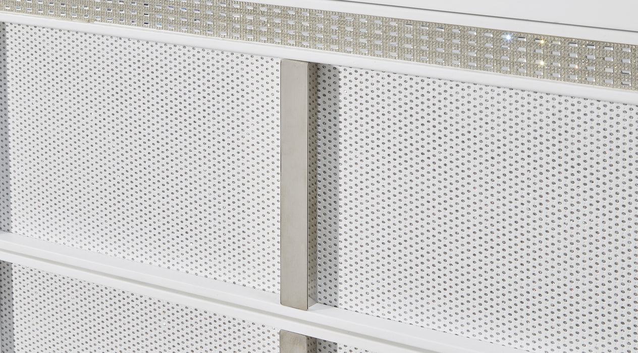 Details Includes queen upholstered headboard, storage footboard, rails and roll slats, Made with solid wood components, MDF substrate and decorative laminate, White lacquer finish, Vertical metal drawer pulls, Faux leather upholstery, Built-in LED lighting with 3-way dimmer switch, 2 drawers with fully finished interior, dovetail construction and ball-bearing side glides, Drawers with rhinestone frames; textured laminate drawer fronts, Power cord included; UL Listed, Bed does not require additional foundation/box spring; accommodates most zero clearance adjustable bases with the addition of a bunkie board, Mattress available, sold separately, Assembly required