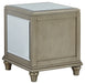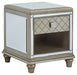 Glamorous, chic and sophisticated. This rectangular end table is made with a metallic silvertone finish, inset beveled mirror panels and drawer pulls adorned with faux crystals. No matter how you style it, this table is a stunning addition to your contemporary decor.