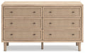 Clean-lined and contemporary—but far from stark—this dresser is a fresh style awakening. Pairing a light finish with replicated oak grain and textured beige details that replicate the look of cane, its mixed materials bring a naturally versatile vibe to your bedroom. Sleek, simple hardware plays perfectly with the modern aesthetic. Prepare to have your mind blown by the vast universe of possibilities that await within the spacious drawers.