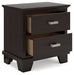 Feast your eyes on this richly versatile nightstand. Its traditional-inspired dark brown finish effortlessly blends with contemporary bright nickel-tone pulls to create a stunning look that's not too stuffy or too trendy. Spacious drawers offer plenty of room to tuck away your bedside must-haves.