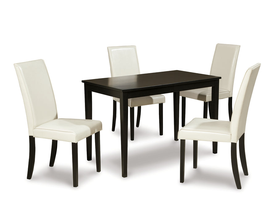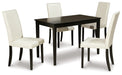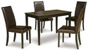 This dining table set might be big on style, but its petite scale is ideally suited for small spaces. With a dark finish and a minimalist design, the table is the epitome of contemporary decor. Four comfortably cushioned high-back chairs covered in a dark brown faux leather make it easy to linger at the table.