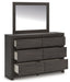 | Details | Includes dresser and mirror, Made with engineered wood (MDF/particleboard/plywood) and decorative laminate for the right balance of affordability and durability , Dark charcoal finish over replicated oak grain, Decorative laminate replicates natural or man-made material surfaces with consistent color, pattern and texture, Recessed hand grabs create hardware-less effect, 6 smooth-gliding drawers, Drawer interiors are lined with a faux linen laminate for a clean, finished look , Safety is a top priority, clothing storage units are designed to meet the most current standard for stability, ASTM F 2057 (ASTM International), Drawers extend out to accommodate maximum access to drawer interior while maintaining safety, Mirror attaches to back of dresser; can also be mounted on wall horizontally or vertically, Assembly required | |