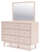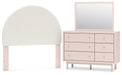 Details B1323-87: Made with durable engineered wood frame covered in a creamy white boucle, Polyester upholstery, ¼" bolts (not included) are needed to attach headboard to your existing bed frame, Minor assembly required, B1323B1: Includes dresser and mirror, Made with engineered wood (MDF/particleboard/plywood) and decorative laminate for the right balance of affordability and durability, Subtle blush finish over replicated pecan wood grain, Decorative laminate replicates natural or man-made material surfaces with consistent color, pattern and texture, Champagne colored knobs, 6 smooth-gliding drawers , Drawer interiors are lined with a faux linen laminate for a clean, finished look, Mirror can be attached to back of dresser or wall mounted horizontally or vertically, Safety is a top priority, clothing storage units are designed to meet the most current standard for stability, ASTM F 2057 (ASTM International) , Drawers extend out to accommodate maximum access to drawer interior while maintaining safety, Minor assembly required,