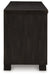 | Details | Made with hardwood solids and thick rustic oak veneer, Black finish with rubbed-through edges, Metal bar pulls with rustic texture in a dark pewter-tone finish, 2 cabinets with glass front doors, each with an adjustable shelf, 2 storage drawers, Cutouts for wire management, Minor assembly required, simply lay flat and attach feet | |