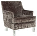 This accent chair with shelter arm styling merges contemporary and traditional styling in the most beautiful way. The combination of polyester crushed velvet upholstery and tapered clear acrylic legs makes for one cool contrast. Combining comfort and fashion-forward design for the modern enthusiast.