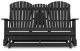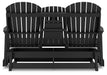 Drift away from everyday worries and into outdoor bliss with this glider loveseat. Dressed in chic black, the Adirondack-inspired design has a classic feel. It weathers sunny summer days and cozy winter nights with durable MEGA-TUFF® HDPE material. A drop-down console with integrated cup holders keeps refreshments and snacks within easy reach. With the console snapped into the back, this loveseat has even more room for enjoying lazy days in the shade.