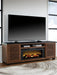 Double down on casual chic with the two-tone look of this TV stand with electric fireplace. Its warm brown and matte black finishes reflect your eye for modern design. The trend-right slatted styling brings added charm. And with handy cabinets, shelving and cord management holes, keeping entertainment consoles and accessories organized is a breeze. Enhancing the experience, the fireplace insert brings a touch of warmth and beautiful ambiance to your living room. With the touch of a button, adjust the temperature and the flame brightness, and connect your device to the built-in wireless speakers. The flame effect includes a realistic-looking log set with glowing embers, along with an ambient down light.