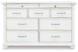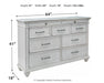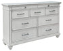 Give your retreat vintage charm and valuable drawer storage with this dresser. In a beautifully distressed whitewash finish, you'll love putting it all away in casual style. Seven full-sized drawers and two accessory top drawers will easily accommodate your needs. Generously scaled moulding from top to bottom, along with bun feet and drawer handles with a transitional aesthetic, give this dresser character—evoking the feel of a quaint cottage escape.