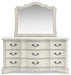 | Details | B980B4: Includes headboard, footboard and rails, Made with hardwood solids, spruce veneer, MDF substrates and cast resin components , Antiqued white painted finish, Polyester upholstery, Button tufting, Foundation/box spring required, sold separately, Mattress available, sold separately, Assembly required, B980B1: Includes dresser and mirror, Made with hardwood solids, spruce veneer, MDF substrates and cast resin components, Antiqued white painted finish, 9 drawers with fully finished interiors, French and English dovetail construction and ball-bearing side glides, Metal bar pulls with aged pewter-tone finish, Mirror attaches to back of dresser, | |