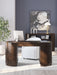 This home office desk is perfectly modern in every way. Finished on both sides in a rich wood tone, it can be floated in a room or used as a divider. Two half round door cabinets, each with an adjustable shelf, deliver a well-organized space for work-from-home professionals. It's a striking study in upscale contemporary form and function.
