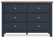 Add homespun charm to your restful retreat. A modern take on a timeless silhouette, this dresser pairs a dark slate blue finish with a light brown top. Drawer fronts and legs in a classic Shaker style bring an air of beautiful simplicity to the bedroom. Whether it's part of a charmingly curated guest suite or a casually carefree kids room, this dresser is a welcome addition.
