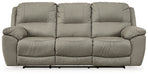 Kick back, relax, and enjoy some sports on TV with this power reclining sofa. You will love its double stuffed pillow top arms and soft-as-suede faux leather upholstery. The family-friendly dark gray color and creative stitching add panache. Recline in infinite positions of comfort while you plug in your devices to the convenient USB charging station. This bustle back sofa will always be a win.