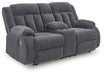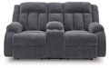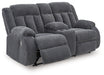 There's no need to sacrifice looks for comfort—this power reclining loveseat with console serves up both, plus a richly relaxed sense of style. Its steel-hued velvet upholstery is ultra soft, with a plush waffle weave for an added layer of interest. The overstuffed pillow top armrests are custom made for lazy afternoon catnaps. A one-touch power control takes the pleasure of reclining to a higher level, while cup holders and USB charging help keep essentials close by.