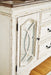 | Details | Made of veneers, wood and engineered wood, Antiqued two-tone finish, 3 smooth-gliding drawers with dovetail construction and felt bottoms, Bail pulls and knobs in dark bronze tone finish, Pair of cabinet doors with inset mirrored glass and decorative fretwork, 2 adjustable shelves, Assembly required | |