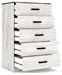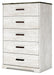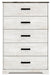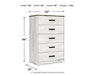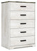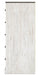 Details Made with engineered wood (MDF/particleboard/plywood) and decorative laminate for the right balance of affordability and durability, Whitewash replicated worn through paint, Top with rustic gray planked replicated oak grain with authentic touch, Pewter-tone pulls, 5 smooth-gliding drawers with vinyl-wrapped sides and back, Safety is a top priority, clothing storage units are designed to meet the most current standard for stability, ASTM F 2057 (ASTM International), Drawers extend out to accommodate maximum access to drawer interior while maintaining safety, Assembly required