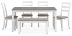 Details Includes dining table, bench and 4 chairs, Made with hardwood solids, veneer and MDF substrate, Clean white finish, Table top with gray wood-tone finish, Polyester upholstery, Foam cushioned seats, Assembly required
