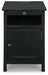 Add big character to a small space with this chairside end table. With its compact size and strong silhouette, it can go anywhere and blend easily into the decor. Less is so much more with the Shaker-inspired design and black wood tone finish. Loaded with form and function, this end table displays accent pieces and stores essentials securely while keeping devices powered up.