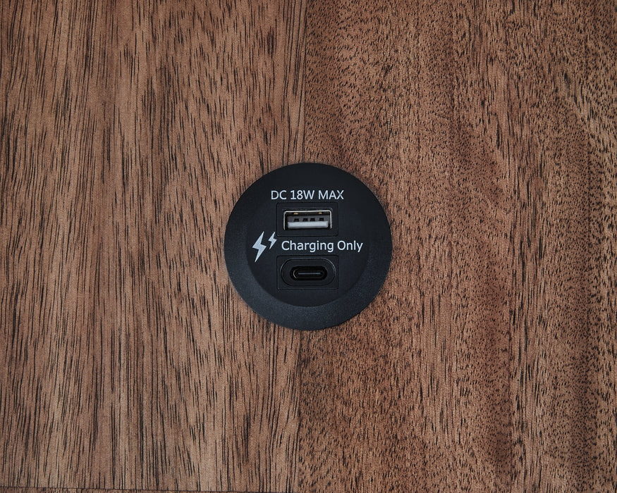 Raise the bar on modern farmhouse style with this chairside end table. Its sturdy silhouette and casual good looks are accentuated with a two-tone finish, which pairs a warm satin black base with a contrasting butcher block veneer top. Spacious storage drawers and dual USB charging ports keep devices powered up and close at hand. Whether your style is vintage, country or eclectic, this table adds a hearty element.
