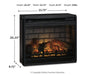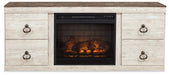 Details Includes TV stand, 2 piers, bridge and electric fireplace insert (W100-01), Made with engineered wood (MDF/particleboard) and decorative laminate, Replicated white wash worn through paint; TV stand top with replicated wood grained block pattern with an authentic touch, Nickel-tone hardware, TV stand with 2 storage cabinets (each with an adjustable shelf) and removable/adjustable center shelf, Each pier has 2 open shelves and cabinet door revealing single-shelf storage, Cutouts for wire management and ventilation, Electric fireplace insert provides up to 5,386 BTU/1,500W and warms up to 1,000 square feet (heats larger rooms), 7-level temperature setting; 5 levels of flame brightness; LED-lit multi flame display operates with or without infrared heat; realistic-looking log set with dynamic glowing embers, Remote control with LED display, Timer function with programmable ranges from 10 minutes to 9 hours; overheating control device, Power cord included; UL Listed, Assembly required; simply remove the center shelf and back panel to make room for the fireplace insert