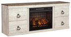 Details Includes TV stand and electric fireplace insert (W100-101), Made with engineered wood (MDF/particleboard) and decorative laminate, Replicated white wash worn through paint; TV stand top with replicated wood grained block pattern with an authentic touch, Antiqued brass-tone ring pulls, TV stand with open storage area and 2 single-door storage areas (each with adjustable/removable shelf), Cutouts for wire management and ventilation, Electric fireplace insert provides up to 5,386 BTU/1,500W and warms up to 1,000 square feet (heats larger rooms), 7-level temperature setting; 5 levels of flame brightness, LED-lit multi flame display operates with or without infrared heat; realistic-looking log set with dynamic glowing embers, Remote control with LED display, Timer function with programmable ranges from 10 minutes to 9 hours; overheating control device, Power cord included; UL Listed, Assembly required; simply remove the center shelf and back panel to make room for the fireplace insert